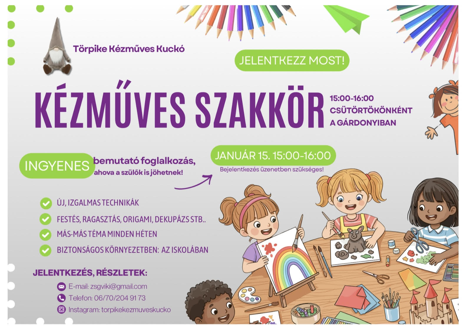 Gárdonyis diákok figyelem! Kézműves szakkör indul minden csütörtökön 15:00-16:00-ig a Győri Gárdonyi Géza Álalános Iskolában. Január 15-én ingyenes bemutkozó foglalkozásra várom szeretettel a diákokat, és szüleik is bátran csatlakozhatnak hozzánk ezen a napon. Január 22-vel kezdődően pedig minden csütörtökön találkozunk!